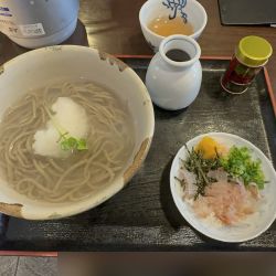 とてもきれいで清潔感のある店舗で観光客に人気の高いお店です。細めで色の濃い蕎麦に辛口のつゆがよく合います。薬味はねぎ・わさび・大根おろしでした。